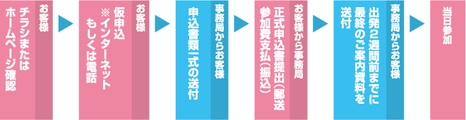 お客様から事務局:正式申込書提出(郵送)、参加費支払(振込) → 事務局からお客様:出発2週間前までに最終のご案内資料を送付 → 当日参加