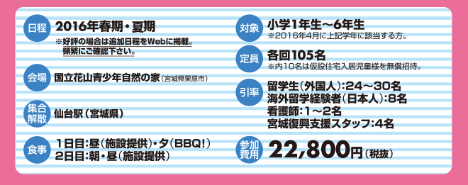 本キャンプは、2012年夏に海から離れた自然豊かな山々のなかで、直接震災の被害にあった仮説住宅入居の小学生達を無償でご招待したことからスタートしました。現在では被災地“宮城”を皮切りに、関東圏に避難した避難生活児童様を対象に“埼玉・東京・千葉・神奈川”でも開催することができております。これも本事業の主旨を理解し、ご参加して頂いている皆様のおかげです。あらためまして御礼申し上げます。本当にありがとうございます。今後も、有償でご参加頂いている皆様の参加費用の一部を活用させて頂き、『仮設住宅入居児童様・避難生活児童様を無償招待』を継続して実施させて頂きます。また2015年度からは、『小学校無償出張授業(留学生が国際交流&多文化共生の出前授業)』として要望を頂戴した小学校様に無償で訪問させて頂きます。引き続き、当事業のご支援ご協力、何卒、宜しくお願い申し上げます。